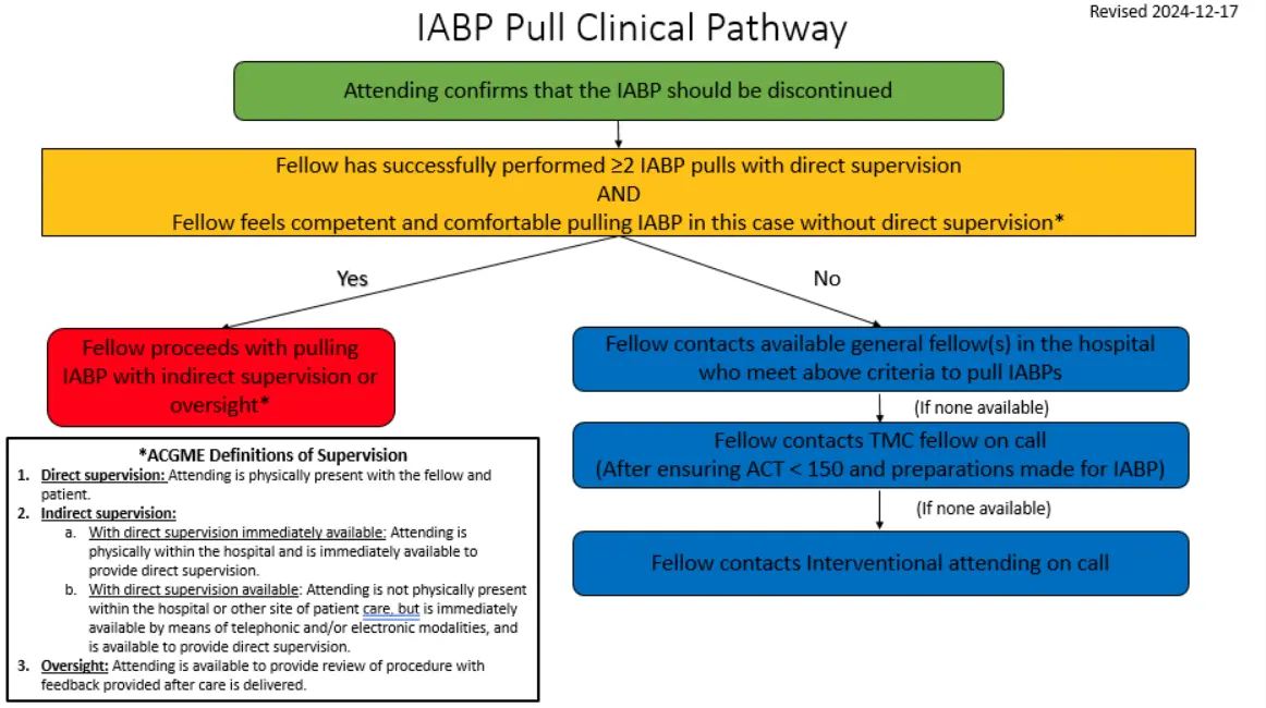 In the very rare situation that attending requests IABP to be pulled after 5 pm for some reason (e.g., ACT didn’t come down < 150 during the day, etc.),