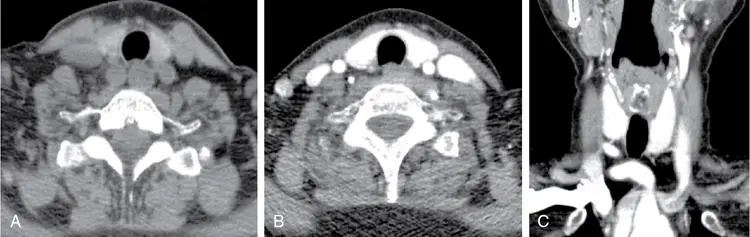 Non-contrast axial CT images (A) shows a normal hyperdense thyroid gland relative to the adjacent skeletal muscles. Contrast axial (B) and coronal (C) images shows intense enhancement of the thyroid gland.