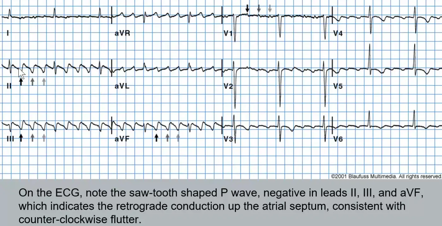 - On the ECG, you will classically observe a saw-tooth shaped P wave, negative in leads II, Ill, and aVF, which indicates the retrograde conduction up the atrial septum, consistent with counter-clockwise (“typical”) flutter.