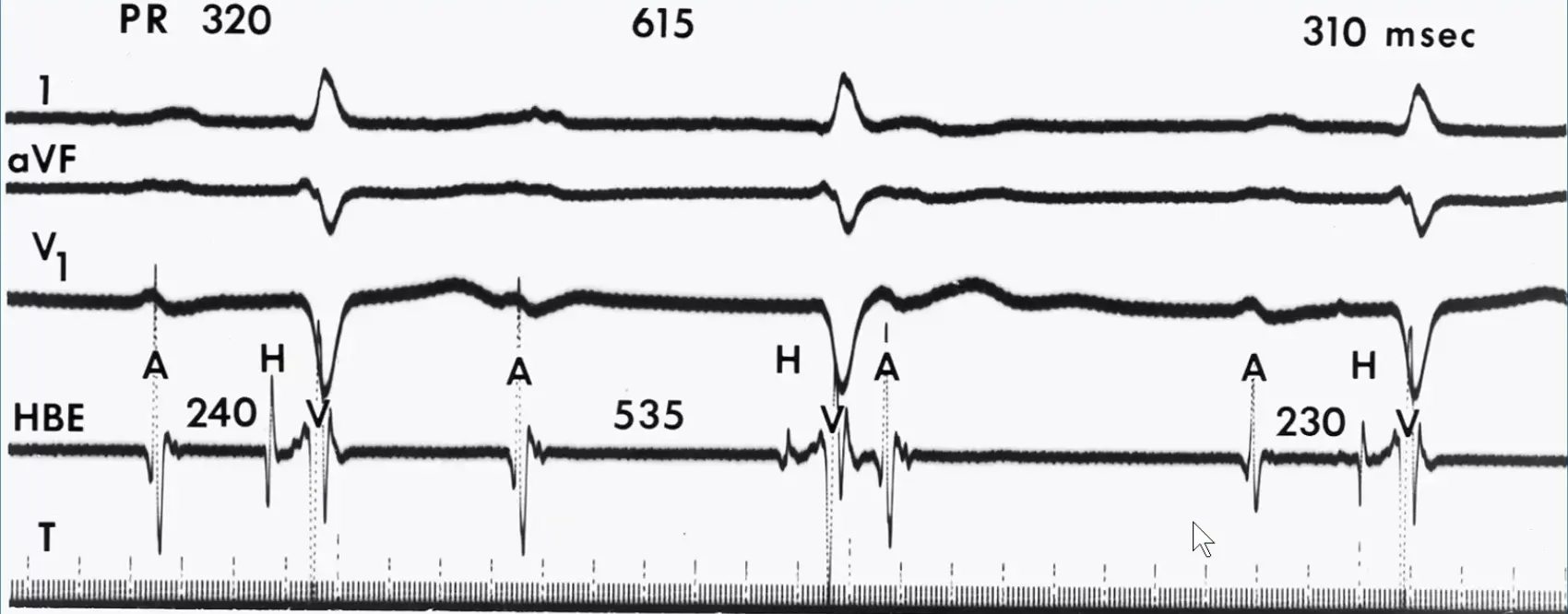 HBE - you see the A without an H after, so this is AV nodal block, i.e. above the His. The example here is Mobitz Type 1.