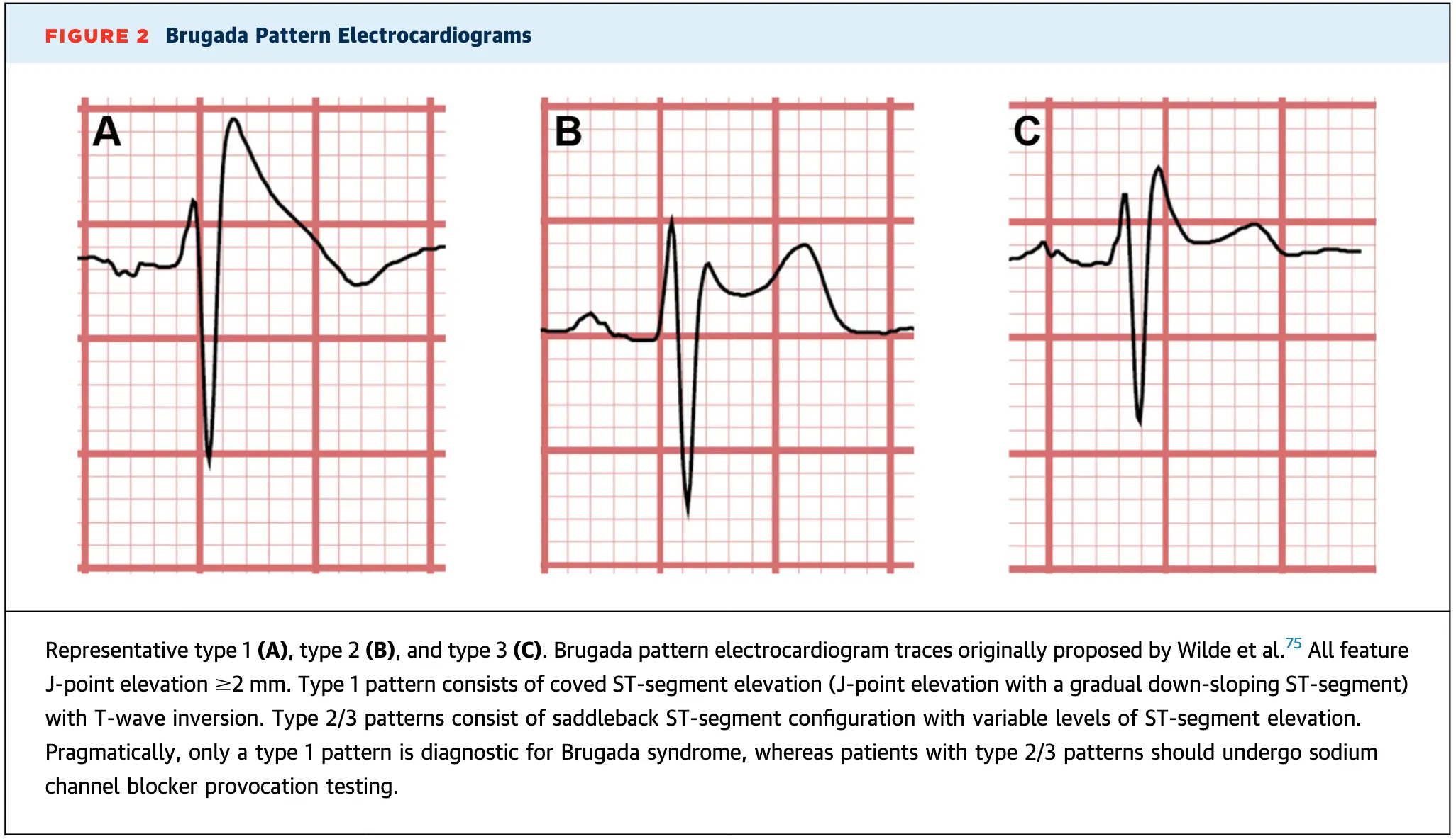 - “coved” ST-segment elevation with T-wave inversion in the right precordial leads