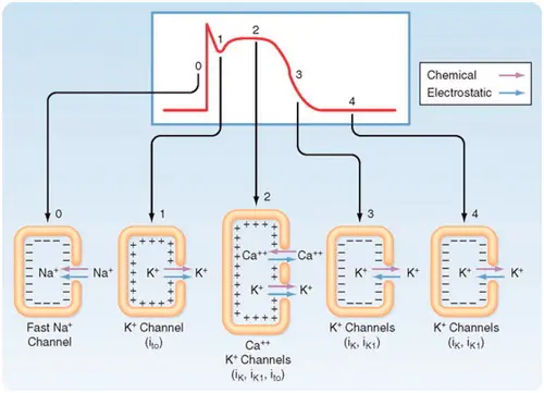 - Phase 3: late repolarization, IKr and IKs channels