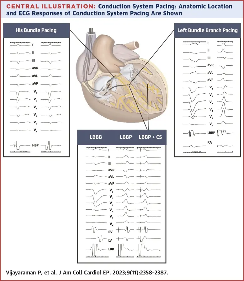 Burri H, Jastrzebski M, Cano Ó, Čurila K, de Pooter J, Huang W, Israel C, Joza J, Romero J, Vernooy K, Vijayaraman P, Whinnett Z, Zanon F. EHRA clinical consensus statement on conduction system pacing implantation: endorsed by the Asia Pacific Heart Rhythm Society (APHRS), Canadian Heart Rhythm Society (CHRS), and Latin American Heart Rhythm Society (LAHRS). Europace. 2023 Apr 15;25(4):1208-1236. doi: 10.1093/europace/euad043. PMID: 37061848; PMCID: PMC10105878. ↩ ↩2 ↩3