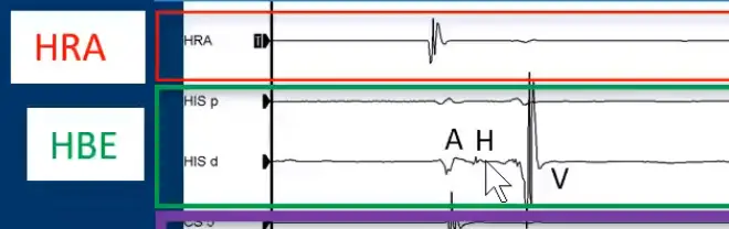 - Notice how the surface lead QRS is before the V on HBE. We use the surface V (QRS) to measure H-V interval, and not the local V (which tends to be after the surface V)