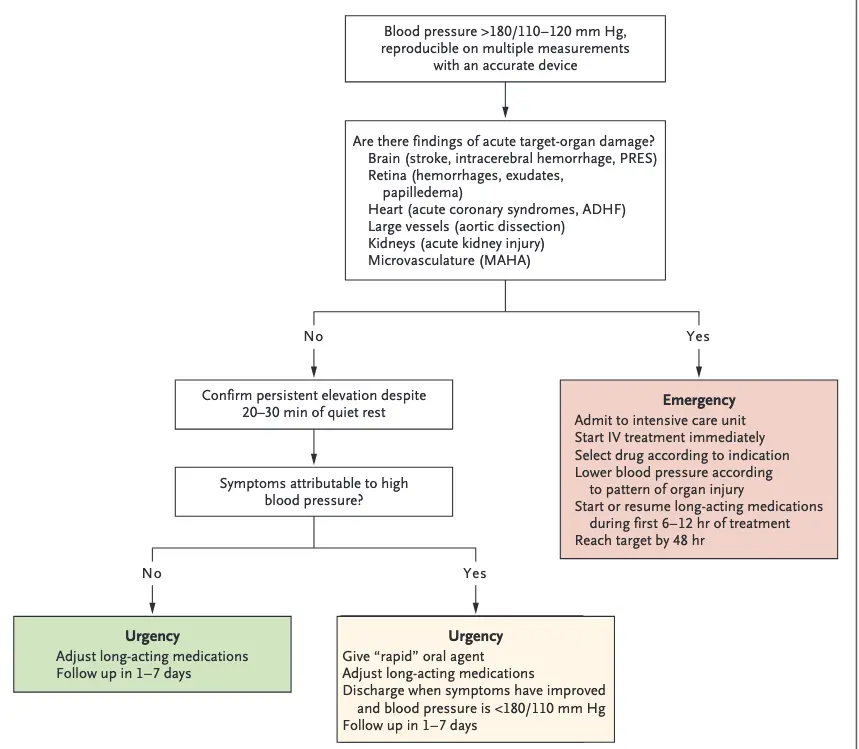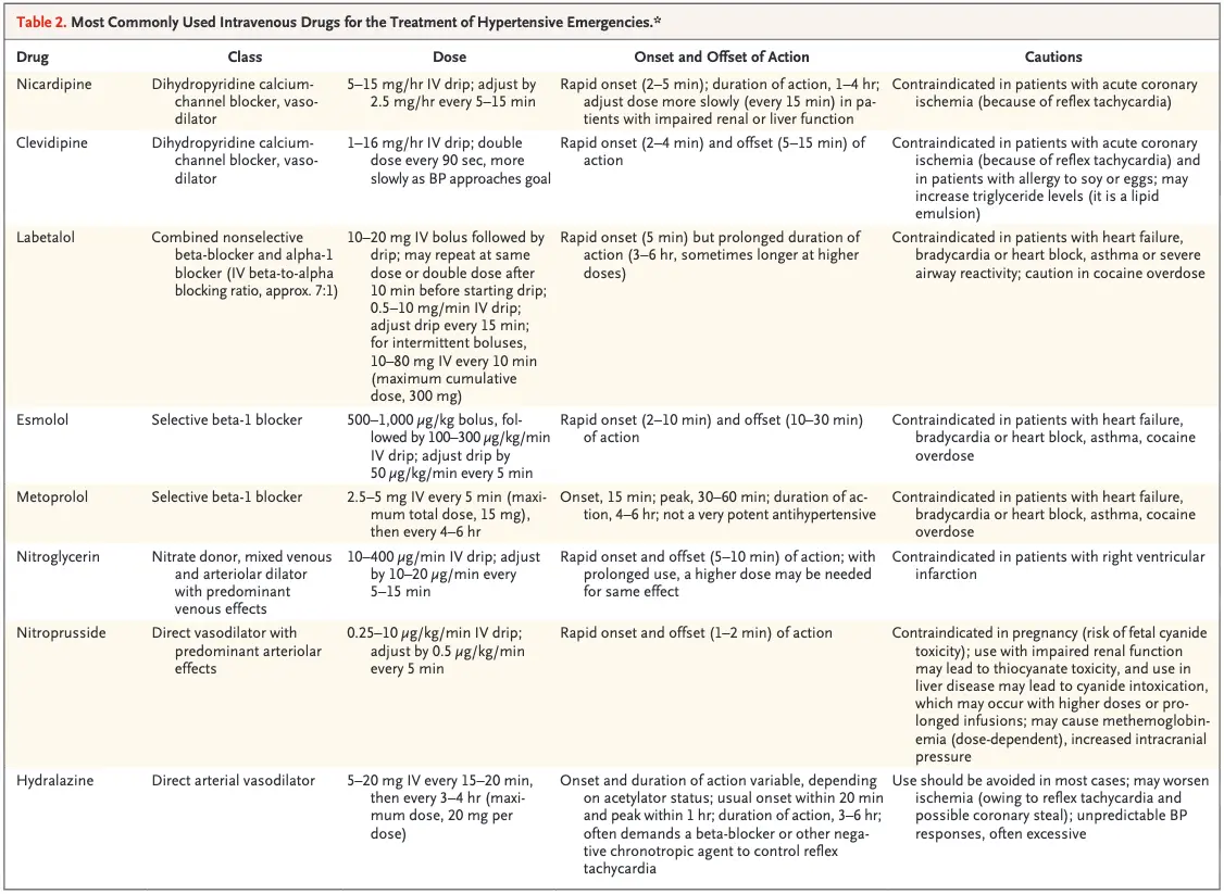 - “For patients with symptoms that are presumed to relate to hypertension but are not indicative of target-organ damage (e.g., headache, atypical chest pain, or epistaxis), it is reasonable to choose an oral agent with a faster onset of action, such as clonidine (0.1 to 0.3 mg), labetalol (200 to 400 mg), captopril (25 to 50 mg), prazosin (5 to 10 mg), or nitroglycerin 2% topical ointment (1 to 2 in.). Nifedipine (given orally or sublingually) should be avoided owing to unpredictable blood-pressure reduction, possibly resulting in cardiovascular events. Medications can be administered every 30 minutes until the target blood pressure is achieved.”1