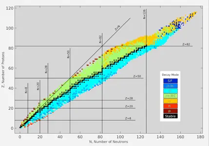 Some nuclei are very stable (black line in the above plot) forming a kind of “valley” of stability in the center. On either side of this “valley” atoms may have too many or too few neutrons (compared to protons) making them unstable.