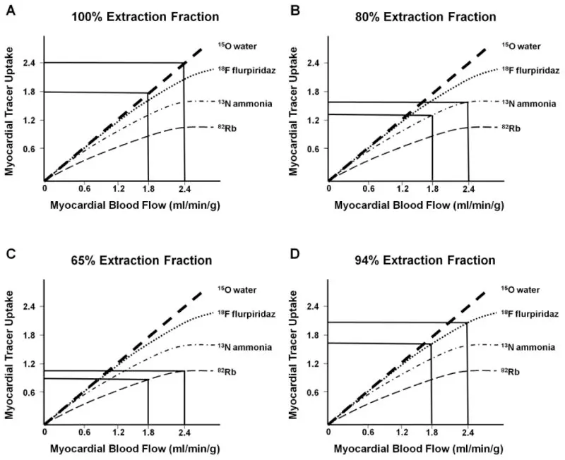 - Rb82 has a relatively lower first-pass extraction and the more prominent nonlinear myocardial uptake with increasing blood flow, termed “roll-off phenomenon” may lead to relatively lower myocardial contrast resolution images when compared with 13N-ammonia