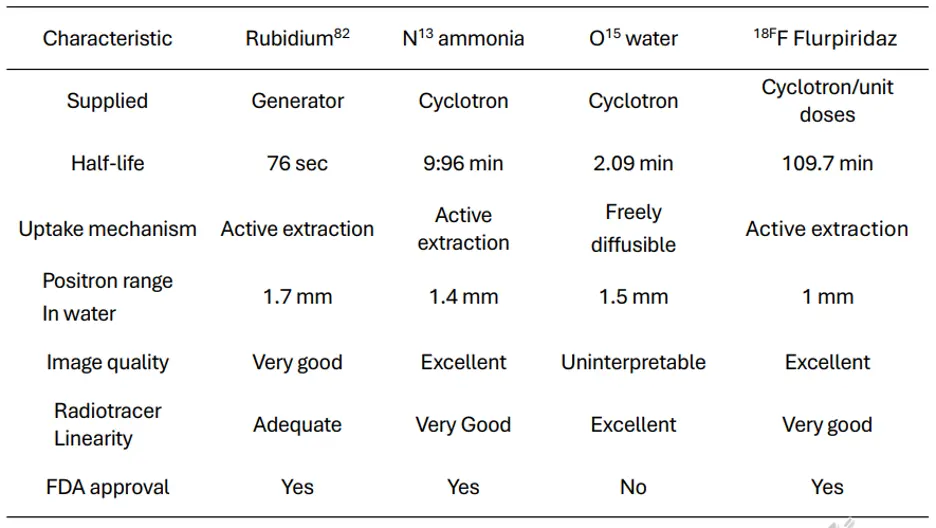 At present, 82rubidium chloride (82Rb) and 13N- ammonia (13NH3) are the most commonly used radiotracers for PET MPI and are both FDA-approved. 15O- water is more frequently used in Europe and is not FDA- approved. 13NH3 and 15O- water require an on-site cyclotron due to their short half-lives. 82Rb also has a short half-life and is generator produced.