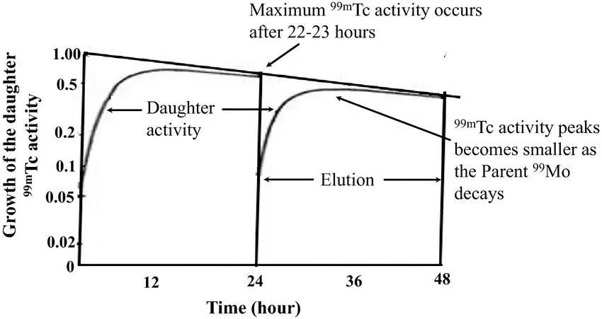 - At ~23 hours is where you have a maximum activity of Technetium () as depicted by the Daughter activity curve.