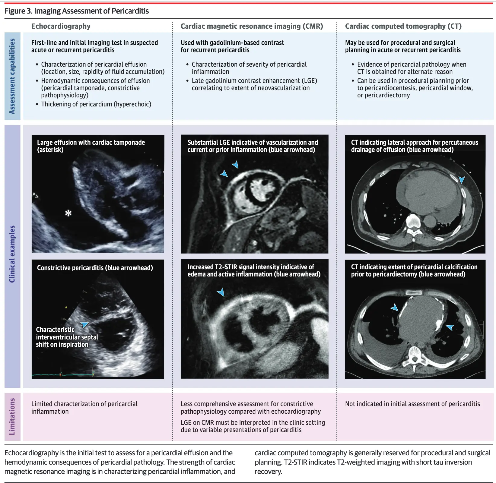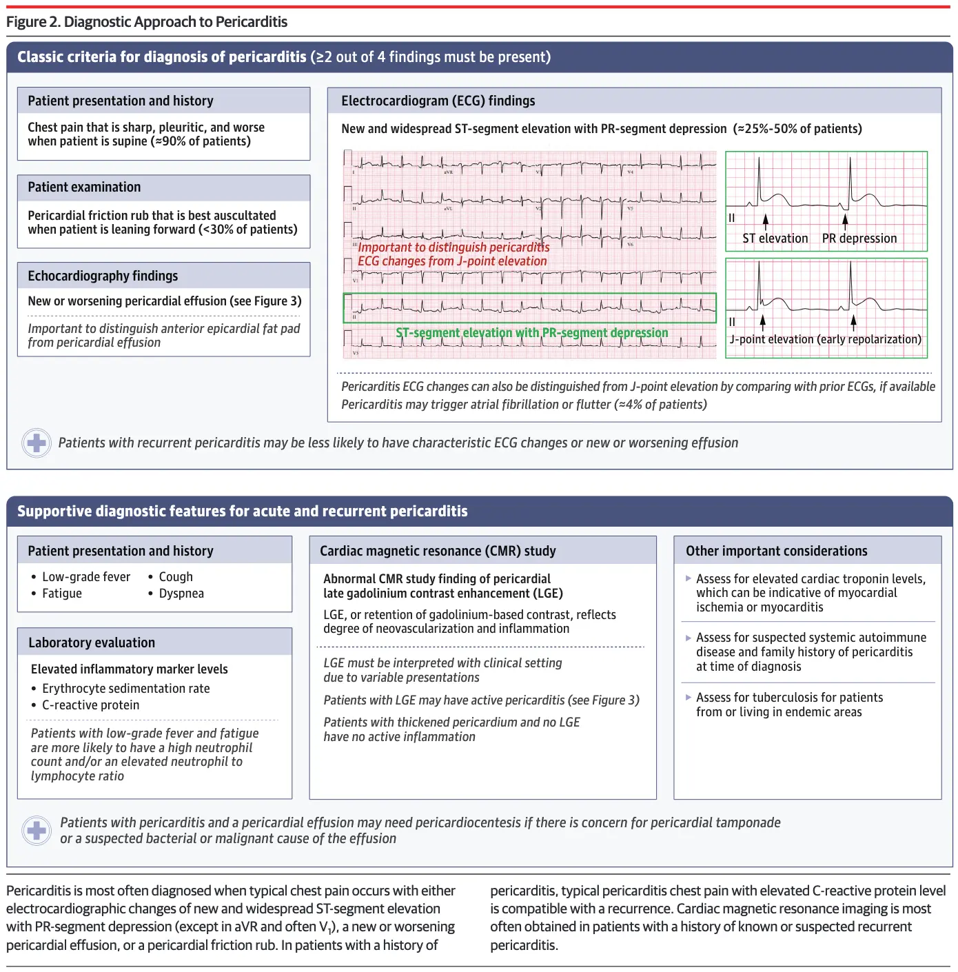 Cremer PC, Klein AL, Imazio M. Diagnosis, Risk Stratification, and Treatment of Pericarditis: A Review. JAMA. 2024;332(13):1090–1100. doi:10.1001/jama.2024.12935 ↩ ↩2 ↩3 ↩4 ↩5 ↩6 ↩7