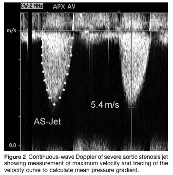 - Severe AS is characterized by a fixed valve area, resulting in an increase in transaortic velocity to ≥4 m/s (mean gradient ≥40 mm Hg) at any flow rate, but with valve area remaining ≤1.0 cm2.