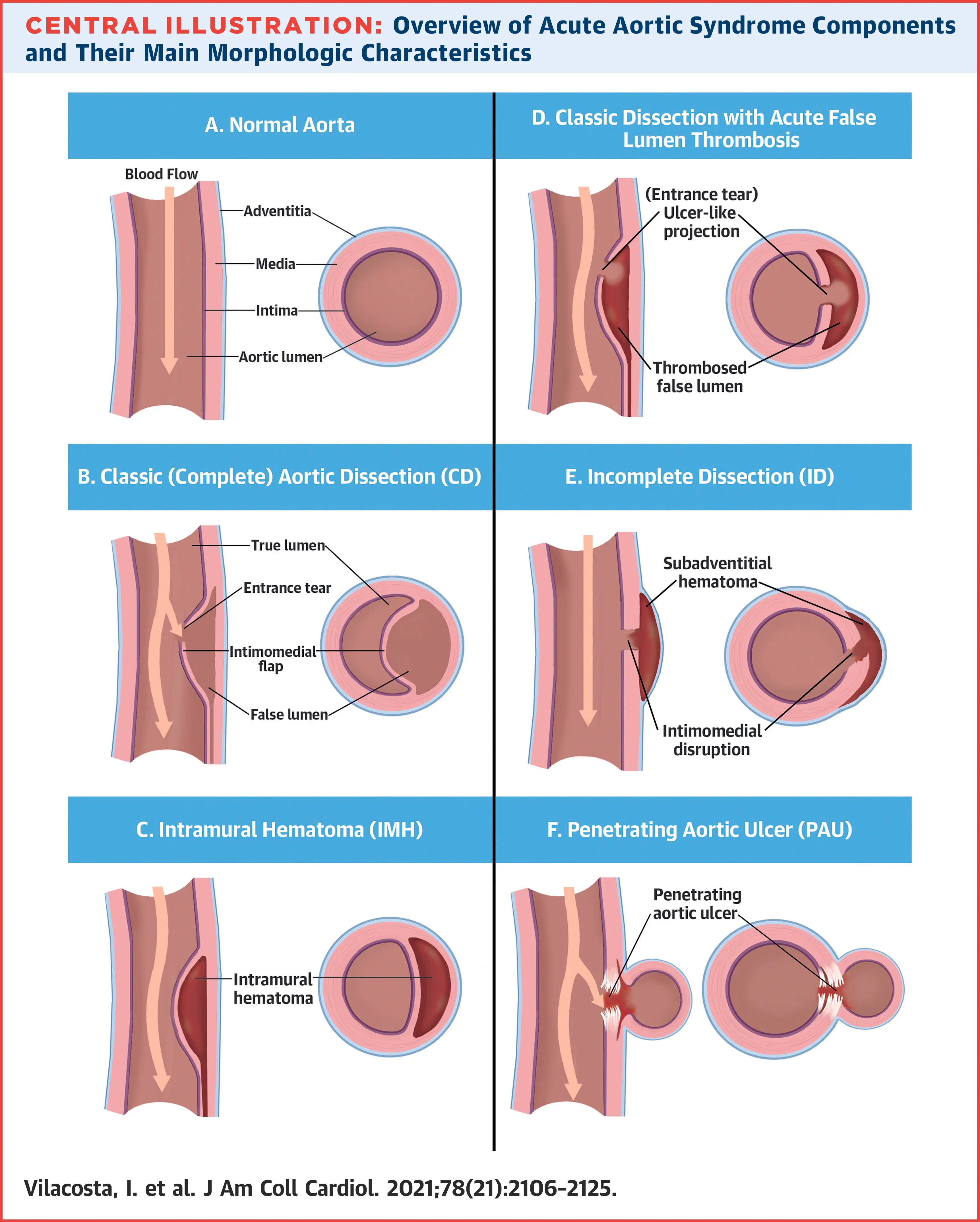 Vilacosta I, San Román JA, di Bartolomeo R, Eagle K, Estrera AL, Ferrera C, Kaji S, Nienaber CA, Riambau V, Schäfers HJ, Serrano FJ, Song JK, Maroto L. Acute Aortic Syndrome Revisited: JACC State-of-the-Art Review. J Am Coll Cardiol. 2021 Nov 23;78(21):2106-2125. doi: 10.1016/j.jacc.2021.09.022. PMID: 34794692. ↩ ↩2 ↩3 ↩4