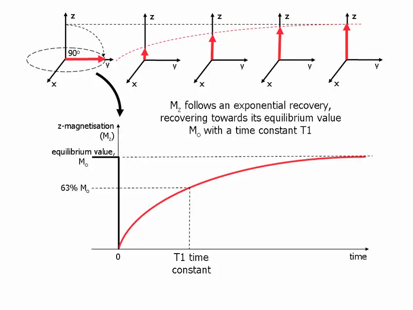 - When this rate of regrowth is mapped over time, the T1 time constant is the amount of time it takes to regain 63% of the intrinsic (full) magnetization ()